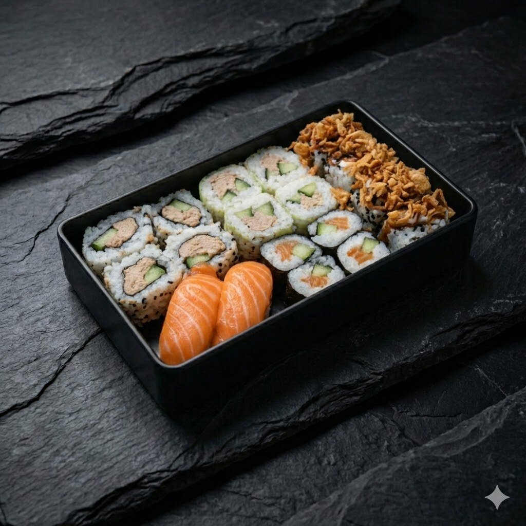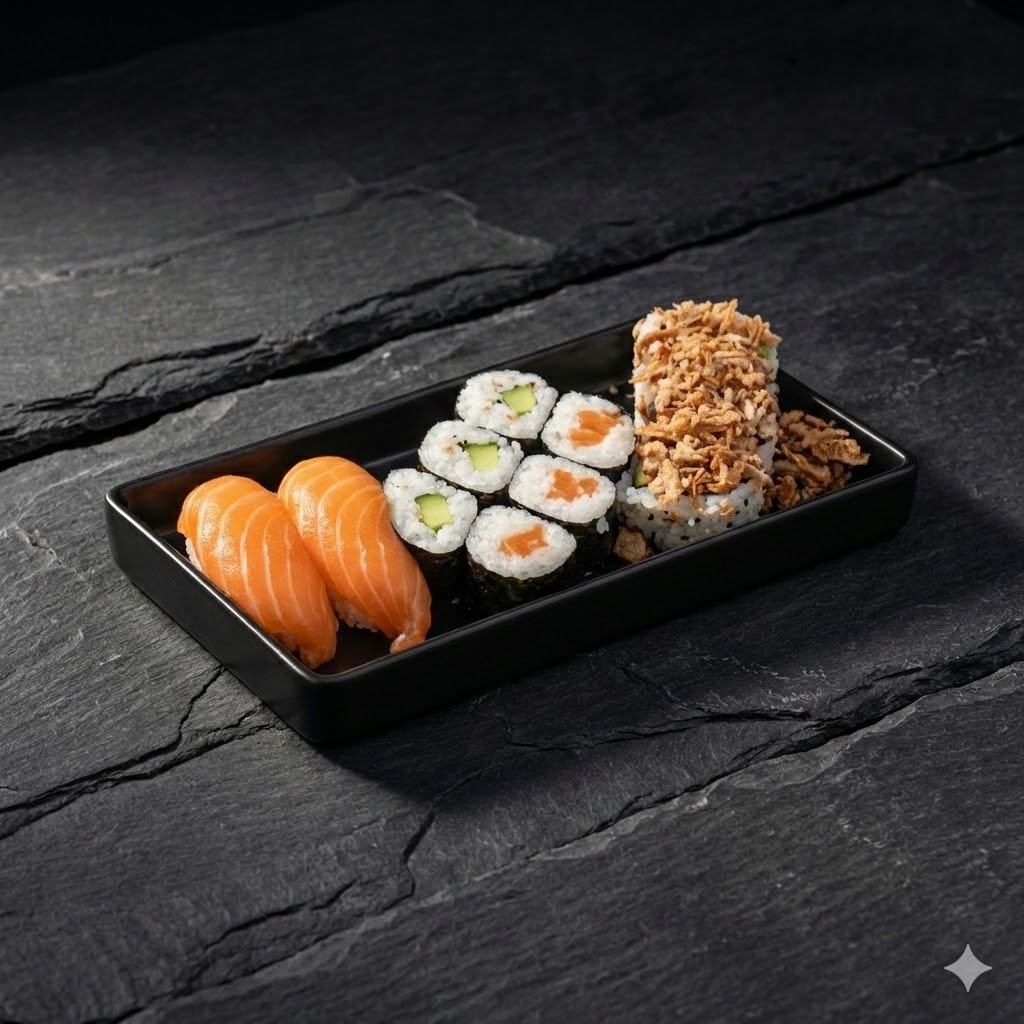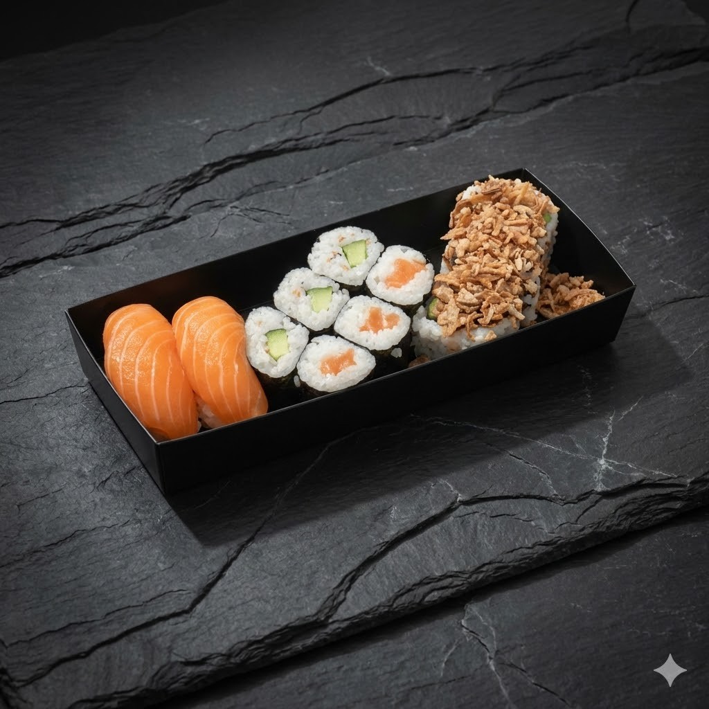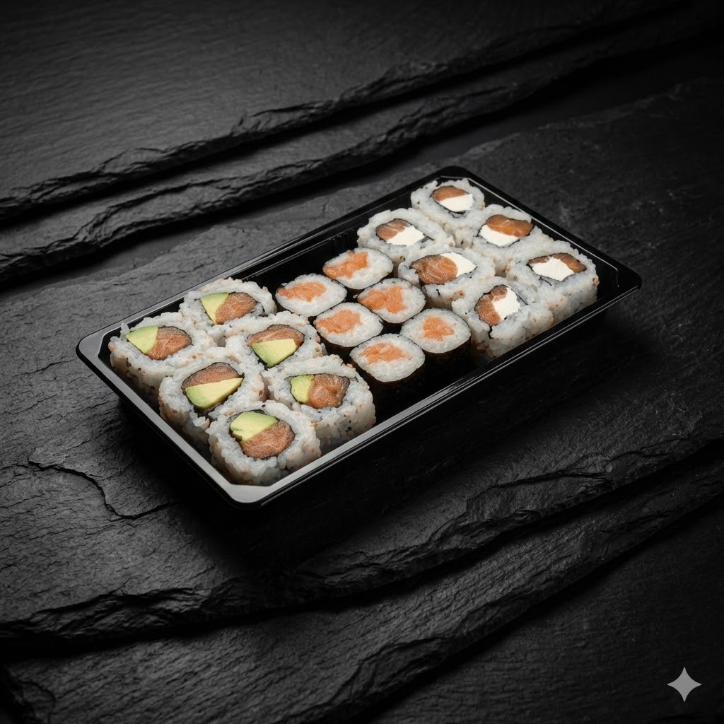 2 Sushis SAUMON, 2 Sushis THON, 2 Sushis CREVETTE, 4 verde SAUMON/CHEESE, 4 California SAUMON Avocat, 4 California crispy surimi, 4 California THON/MAYO, 4 maki THON, 4 Maki SAUMON, 4 Maki Concombre/SESAME, 4 Maki CHEESE