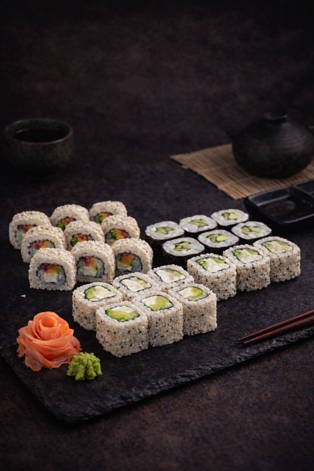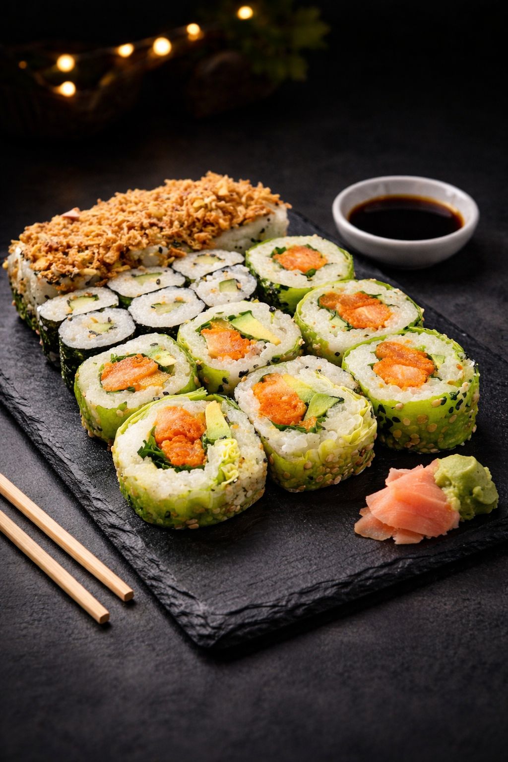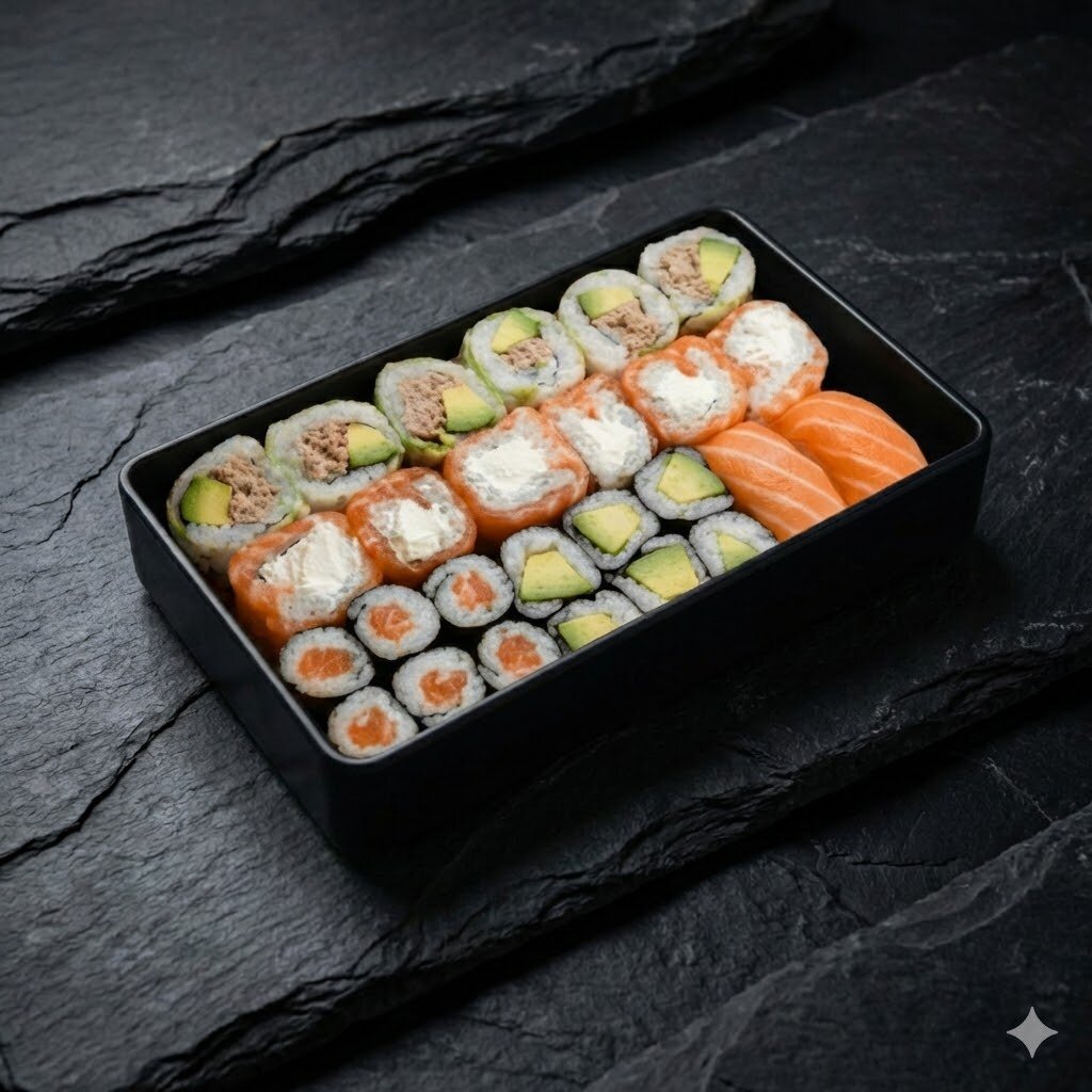 2 Sushis SAUMON, 2 Sushis THON, 2 Sushis CREVETTE, 4 verde SAUMON/CHEESE, 4 California SAUMON Avocat, 4 California crispy surimi, 4 California THON/MAYO, 4 maki THON, 4 Maki SAUMON, 4 Maki Concombre/SESAME, 4 Maki CHEESE