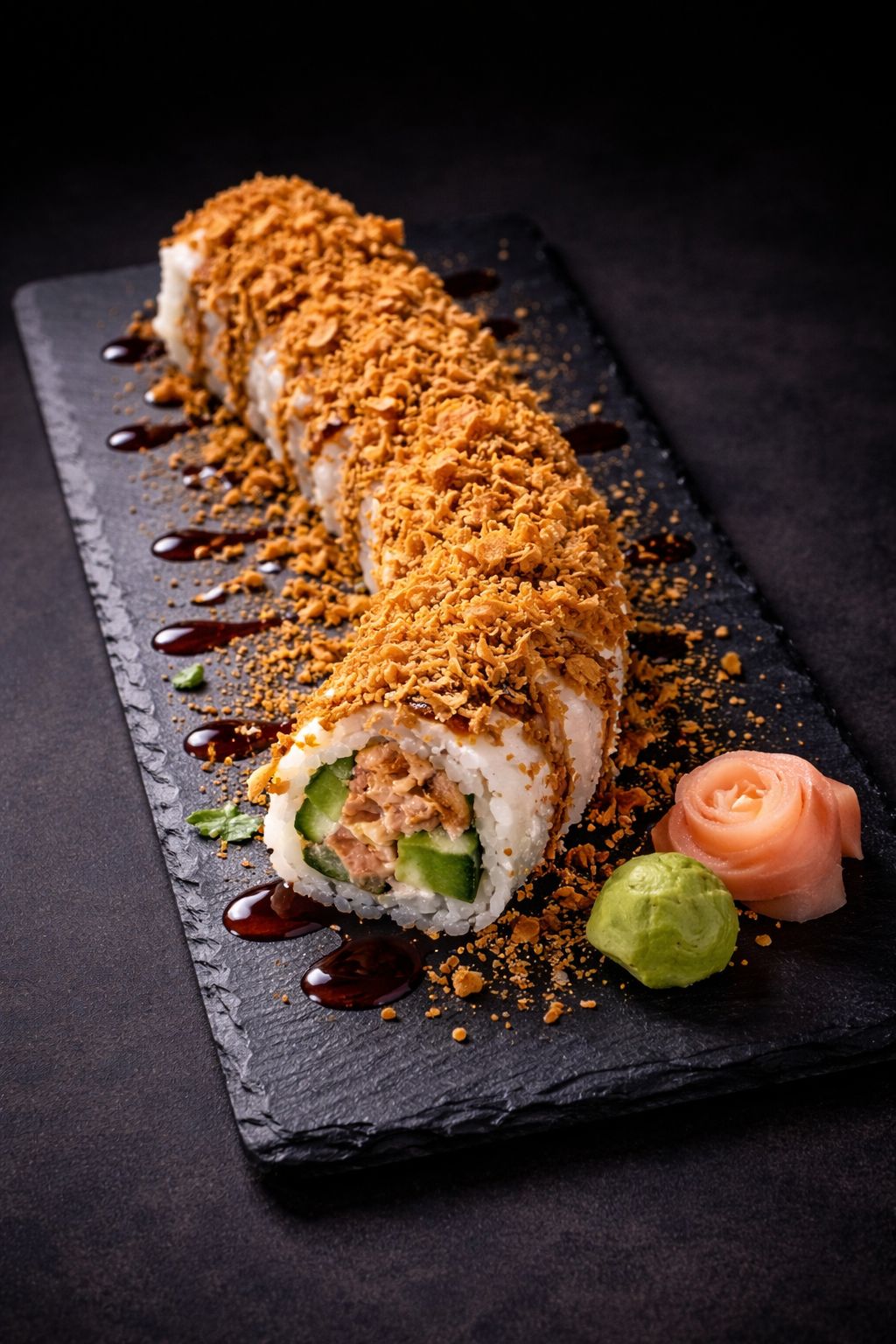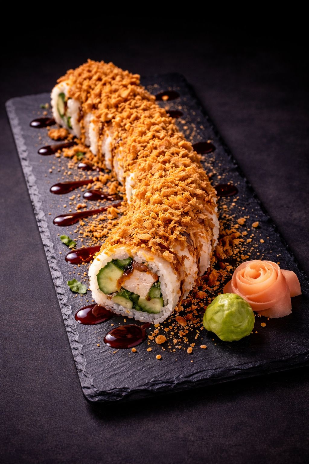 8 pièces avec du poulet pané, avocat fondant et concombre croquant, recouvert d'oignons frits et d'une sauce gourmande.