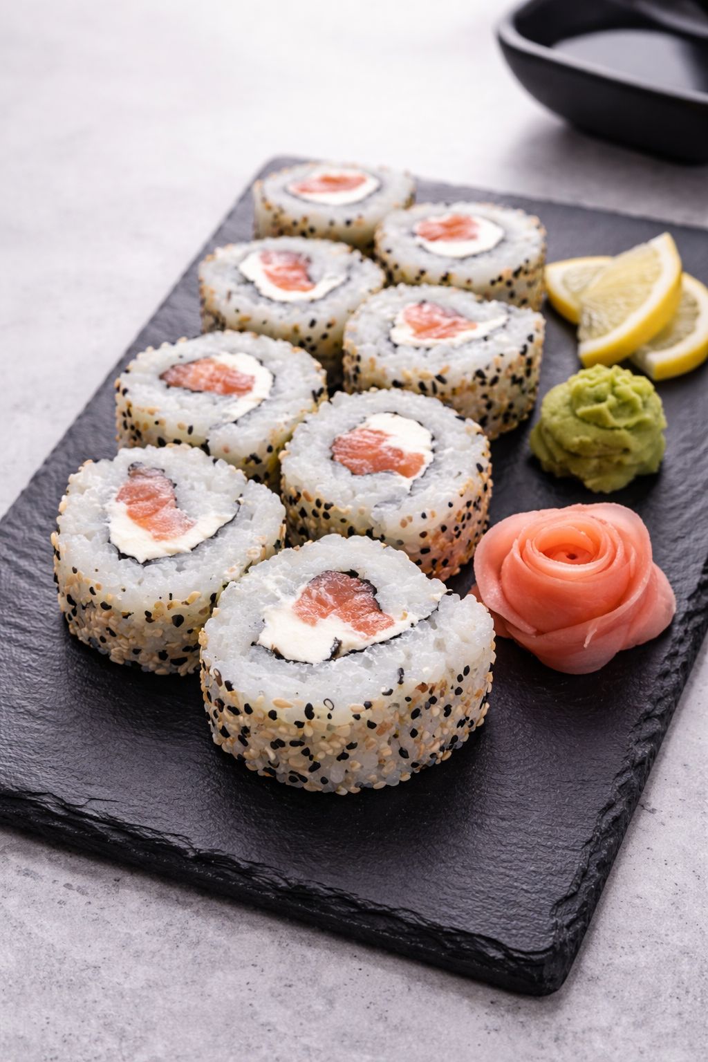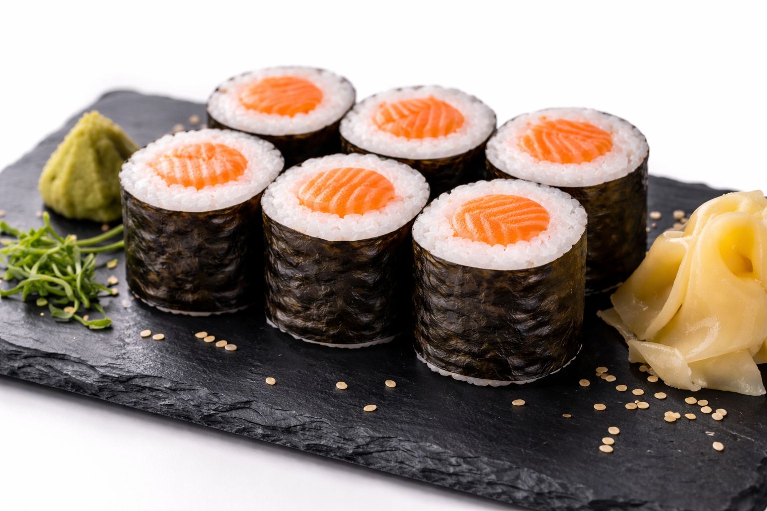 Fines tranches de saumon cru ultra-frais, délicatement coupées à la perfection. Ce plat traditionnel japonais met en valeur la qualité exceptionnelle du poisson, servi avec de la sauce soja, du wasabi et du gingembre mariné pour sublimer sa saveur naturelle et fondante.