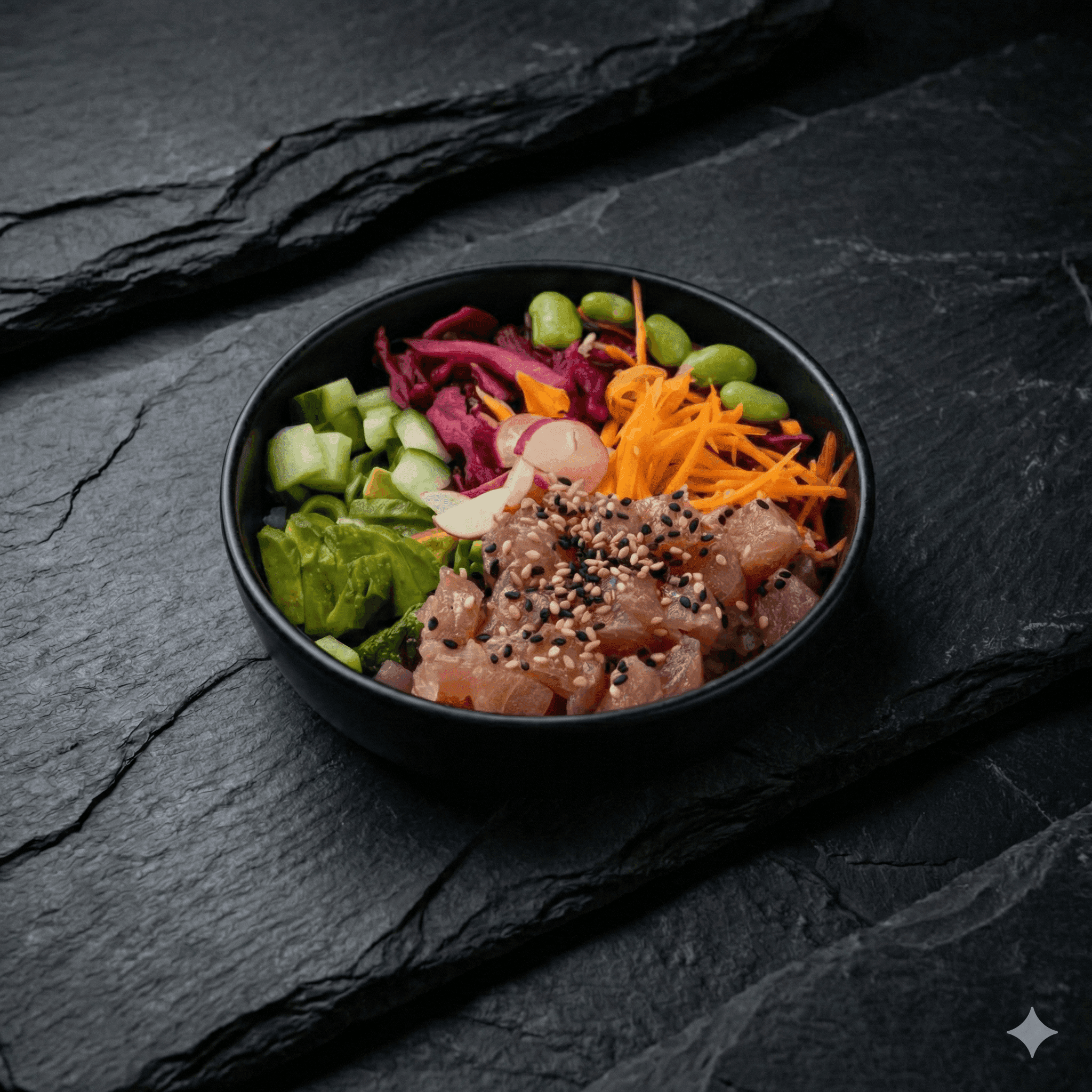 Bowl japonais frais et coloré composé de thon cru mariné en dés, servi sur un lit de riz vinaigré. Garni d'edamame, avocat crémeux, chou rouge, carottes râpées et graines de sésame, le tout relevé d'une sauce savoureuse.