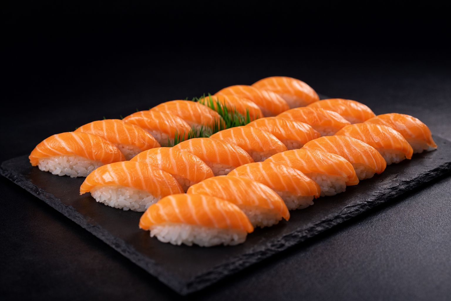 6 Sushis nigiri traditionnels composés de riz vinaigré surmonté de tranches fines de saumon cru ultra-frais. Ce classique japonais met en valeur la qualité exceptionnelle et la saveur fondante du saumon, servi avec de la sauce soja, du wasabi et du gingembre mariné.