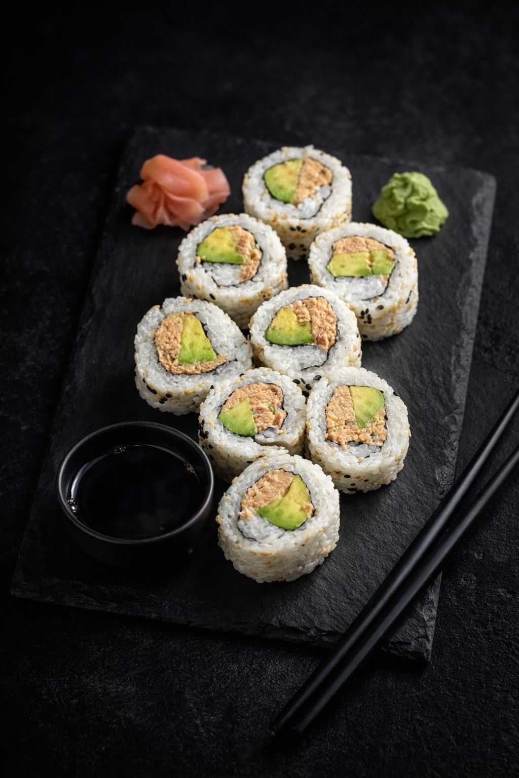 8 California Thon cuit, avocat, mayonaise japonaise.